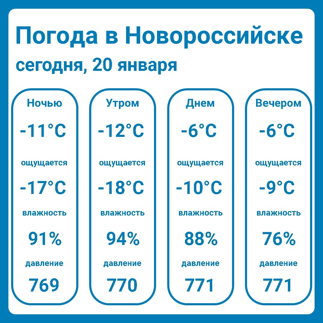 Погода в Новороссийске сегодня 20 января -11°C..-6°C, переменная облачность, без осадков Ночью переменная облачность, без сущ. осадков, температура: -11°C, ощущается как: -17°C, вероятность осадков: 0%, ветер, северо-восточный: 8 м/с, влажность: 91%, давление: 769 мм рт. ст. Утром облачно с прояснениями, без осадков, температура: -12°C, ощущается как: -18°C, вероятность осадков: 0%, ветер, северо-восточный: 7 м/с, влажность: 94%, давление: 770 мм рт. ст. Днем переменная облачность, без осадков, температура: -6°C, ощущается как: -10°C, вероятность осадков: 0%, ветер, северный: 6 м/с, влажность: 88%, давление: 771 мм рт. ст. Вечером облачно, без осадков, температура: -6°C, ощущается как: -9°C, вероятность осадков: 0%, ветер, северный: 4 м/с, влажность: 76%, давление: 771 мм рт. ст. Восход: 07:59 Закат: 17:20 Световой день: 09:21:10 Фаза луны: новолуние ㅤ