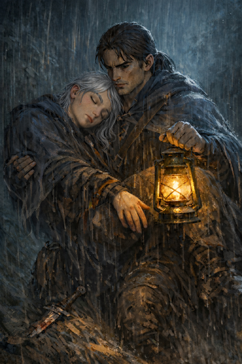 Он взял фонарь, зажёг его, закрыл, проверил, чтобы пламя было ровным и не сбилось от случайного порыва ветра. Потом снял с крюка ещё один плащ — сухой, плотный — и накинул на плечи.