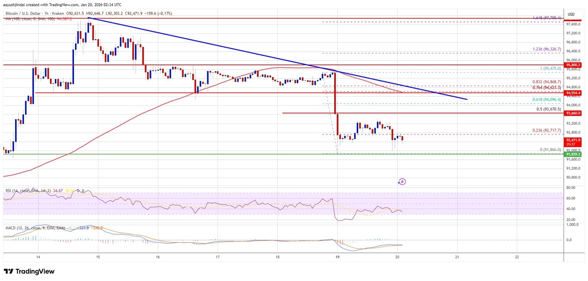 ΠΠΈΡΠΊΠΎΠΉΠ½ Π½Π°ΡΠ°Π» Π½ΠΎΠ²ΠΎΠ΅ ΡΠ½ΠΈΠΆΠ΅Π½ΠΈΠ΅ Π½ΠΈΠΆΠ΅ $94,000 ΠΈ ΠΏΡΠΎΠ΄ΠΎΠ»ΠΆΠ°Π΅Ρ ΠΊΠΎΠ½ΡΠΎΠ»ΠΈΠ΄ΠΈΡΠΎΠ²Π°ΡΡ ΠΏΠΎΡΠ΅ΡΠΈ. Π‘ΡΡΠ΅ΡΡΠ²ΡΠ΅Ρ Π²ΡΡΠΎΠΊΠΈΠΉ ΡΠΈΡΠΊ Π΄Π°Π»ΡΠ½Π΅ΠΉΡΠ΅Π³ΠΎ ΠΏΠ°Π΄Π΅Π½ΠΈΡ, Π΅ΡΠ»ΠΈ ΡΠ΅Π½Π° ΠΎΠΏΡΡΡΠΈΡΡΡ Π½ΠΈΠΆΠ΅ $91,500. ΠΠ° ΡΠ°ΡΠΎΠ²ΠΎΠΌ Π³ΡΠ°ΡΠΈΠΊΠ΅ BTC/USD ΡΠΎΡΠΌΠΈΡΡΠ΅ΡΡΡ ΠΌΠ΅Π΄Π²Π΅ΠΆΡΡ Π»ΠΈΠ½ΠΈΡ ΡΡΠ΅Π½Π΄Π° Ρ ΡΠΎΠΏΡΠΎΡΠΈΠ²Π»Π΅Π½ΠΈΠ΅ΠΌ Π½Π° ΡΡΠΎΠ²Π½Π΅ $94,600. π ΠΠ»ΡΡΠ΅Π²ΡΠ΅ ΠΌΠΎΠΌΠ΅Π½ΡΡ: - Π’Π΅ΠΊΡΡΠ°Ρ ΡΠ΅Π½Π°: Π½ΠΈΠΆΠ΅ $93,000. - ΠΠΈΠ½ΠΈΠΌΡΠΌ Π΄Π½Ρ: $91,866. - ΠΠ»ΡΡΠ΅Π²ΠΎΠ΅ ΡΠΎΠΏΡΠΎΡΠΈΠ²Π»Π΅Π½ΠΈΠ΅: $93,650 ΠΈ $94,000. - ΠΠ»ΡΡΠ΅Π²Π°Ρ ΠΏΠΎΠ΄Π΄Π΅ΡΠΆΠΊΠ°: $92,000, Π΄Π°Π»Π΅Π΅ $91,800 ΠΈ $91,200. - MACD: Π½Π°Π±ΠΈΡΠ°Π΅Ρ ΡΠ΅ΠΌΠΏ Π² ΠΌΠ΅Π΄Π²Π΅ΠΆΡΠ΅ΠΉ Π·ΠΎΠ½Π΅. - RSI: Π½ΠΈΠΆΠ΅ ΡΡΠΎΠ²Π½Ρ 50. β οΈ Π ΠΈΡΠΊΠΈ: ΠΡΠΎΠ±ΠΎΠΉ ΠΏΠΎΠ΄Π΄Π΅ΡΠΆΠΊΠΈ $91,500 ΠΌΠΎΠΆΠ΅Ρ ΠΏΡΠΈΠ²Π΅ΡΡΠΈ ΠΊ Π΄Π°Π»ΡΠ½Π΅ΠΉΡΠ΅ΠΌΡ ΠΏΠ°Π΄Π΅Π½ΠΈΡ Π΄ΠΎ $90,500, Π° Π·Π°ΡΠ΅ΠΌ Π΄ΠΎ $90,000. ΠΠΎΡΠΈΠ·ΠΎΠ½Ρ: ΠΊΡΠ°ΡΠΊΠΎΡΡΠΎΡΠ½ΠΎ