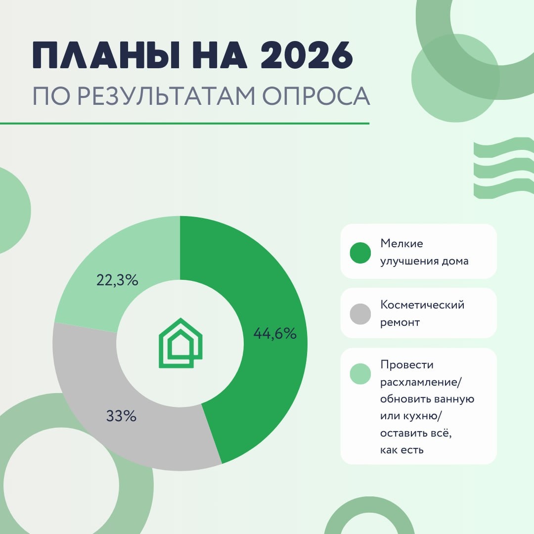 Во-первых, спасибо за участие. Во-вторых, вот какие планы на дом и ремонт вы отмечали чаще всего: 🥇1 место — большинство запланировали мелкие улучшения дома 🥈2 место — кто-то задумал косметический ремонт 🥉3 место — остальная часть ещё не определились, хотят ли они провести расхламление своей территории, обновить ванну/кухню или оставить всё, как есть Мы видим, что у всех планы разные, но цель одна — сделать дом удобнее. Главное, чтобы изменения были в радость, а не в стресс. Если есть конкретные вопросы или задачи — пишите в комментариях, разберём.