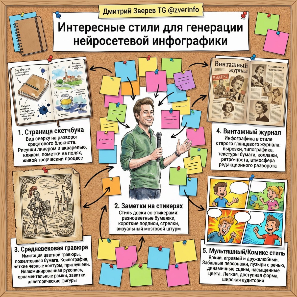 Ваши идеи, платный и бесплатный контент, тексты, предложения, посты, сторисы будут намного нагляднее и понятнее для аудитории, если вы их ВИЗУАЛИЗИРУЕТЕ. Раньше это требовало навыков дизайна, некоторых технических знаний, времени. Сейчас - классную профессиональную инфографику можно делать буквально за несколько минут. И очень просто. С любым соотношением сторон. Горизонтальные, квадратные, вертикальные изображения. С добавлением внешних изображений (например - вашего фото как на прикрепленной к посту картинке). В любом стиле. Выше представлено 5 примеров 😉 ✔️скетчбук ✔️заметки на стикерах (как раз прикрепленная картинка в таком варианте) ✔️средневековая гравюра ✔️винтажный журнал ✔️комикс Попробуйте для вашего контента ✌️ Подробнее про создание инфографики в 7 разных сервисах здесь Как вам? 🔥 — Присоединяйтесь к моему Telegram-каналу- там много практичных постов по инфомаркетингу. Дмитрий.