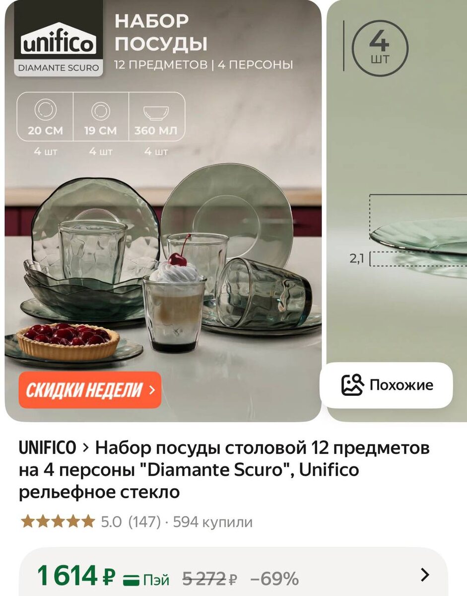 😃😪😃🫨Набор посуды столовой 12 предметов на 4 персоны "Diamante Scuro", Unifico рельефное стекло