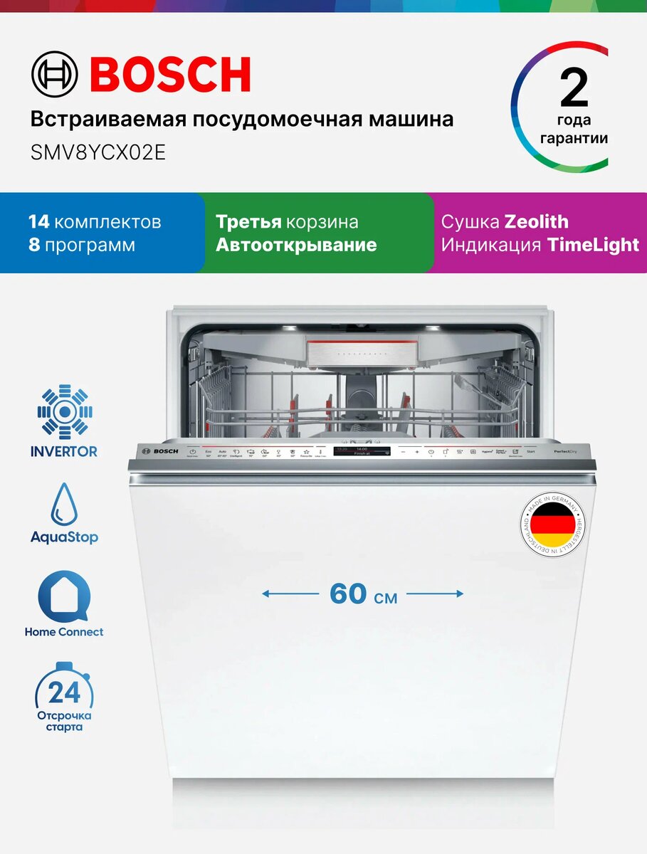 Ищете посудомойку, которая сделает всю работу за вас, включая идеальную сушку? Bosch Serie 8 SMV8YCX02E — это топовая модель с технологией PerfectDry на цеолите и умным управлением. Но действительно ли она избавляет от хлопот полностью и оправдывает ценник премиум-сегмента? Разбираемся на основе технических данных и реальных отзывов. Эта полностью встраиваемая модель скрывается за фасадом кухни, оставляя снаружи лишь лаконичную серебристую панель управления. Несмотря на внешнюю строгость, внутри — целый технологический центр. Модель принадлежит к флагманской Serie 8, что означает высший уровень функциональности, современный дизайн и чрезвычайно тихую работу. Ключевые параметры, собранные из официальных данных и спецификаций магазинов: Плюсы: