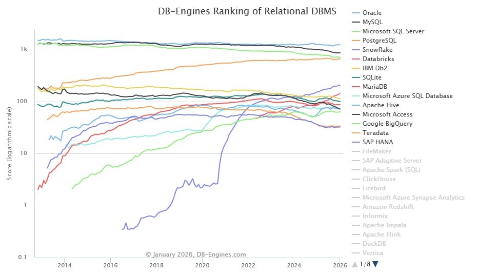 ! Денис на связи. Сегодня будет скорее философский пост 🧠 Раз в год захожу на этот сайтец и смотрю, что там происходит с позициями СУБД. Про метод подсчета можно почитать здесь. До сих пор Oracle занимает первое место среди РСУБД 🔥. Ежегодно PostgreSQL набирает популярность, а в России, хошь не хошь, а заставят на него переползти. Я уже приводил мнения коллег из банка и своё собственное, но есть как есть. Из интересного — Snowflake, который держит 6-е место. Он начал свою экспансию в начале 20-х годов. В 2021 году я даже прошел собеседование в питерскую контору DataArt как раз на Oracle-разработчика с целью переобучиться на Snowflake. Тогда эту СУБД начинали использовать особенно активно. Но в итоге от оффера я отказался: подумал, что уже два года свичусь в Java и будет не комильфо всё забрасывать. Забавно, что СУБД развивается и, судя по рейтингу, становится популярным решением ❄️ В 22-м году DataArt ушла из РФ, перевезя сотрудников в ближнее и дальнее зарубежье. Я опять прошел