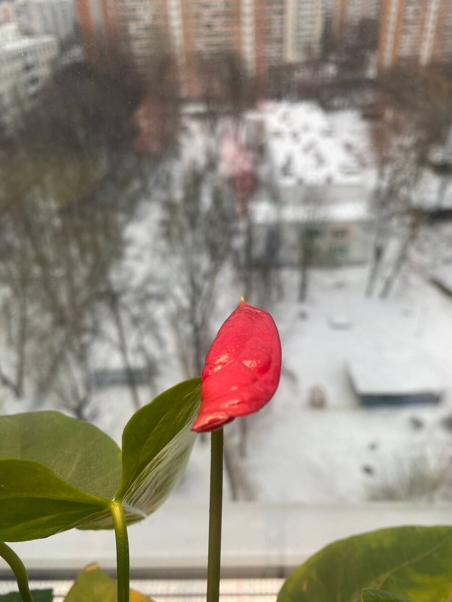 Мой Антошечка сложно распускает свой первый домашний цветочек. Медленно , с усилием. Жду -не дождусь красоты.