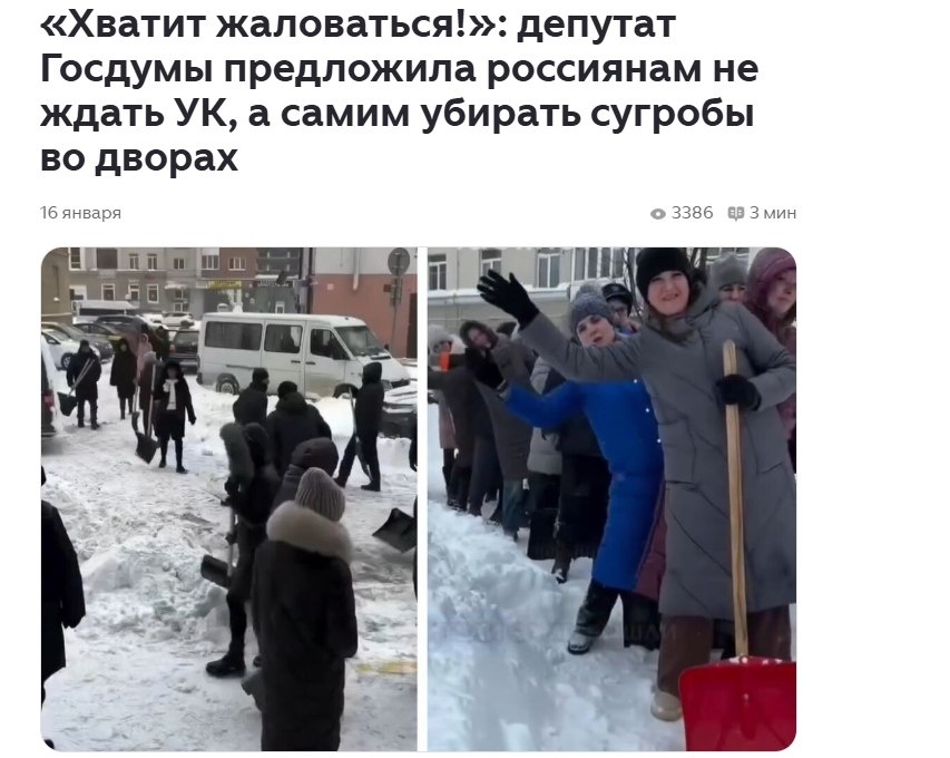 ❄️ Снег лежит, как должок от государства. Депутат Разворотнева — вместо того чтобы спросить с управляшек — зовёт нас на двор с лопатами. Мол, жаловаться вредно: штрафы УК ударят по дворникам. Выходит, платим за ЖКХ, а чистим сами — как в девяностые, только без водки после. В СССР субботники были делом чести. Сейчас — поборы под видом гражданской инициативы. Скиньтесь, мол, на метлу. Или станьте ею.