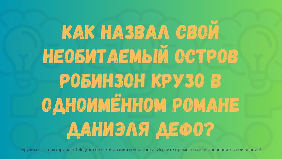 Викторина «Эрудикон» — вопрос №1469. Как назвал свой необитаемый остров Робинзон Крузо в одноимённом романе Даниэля Дефо?