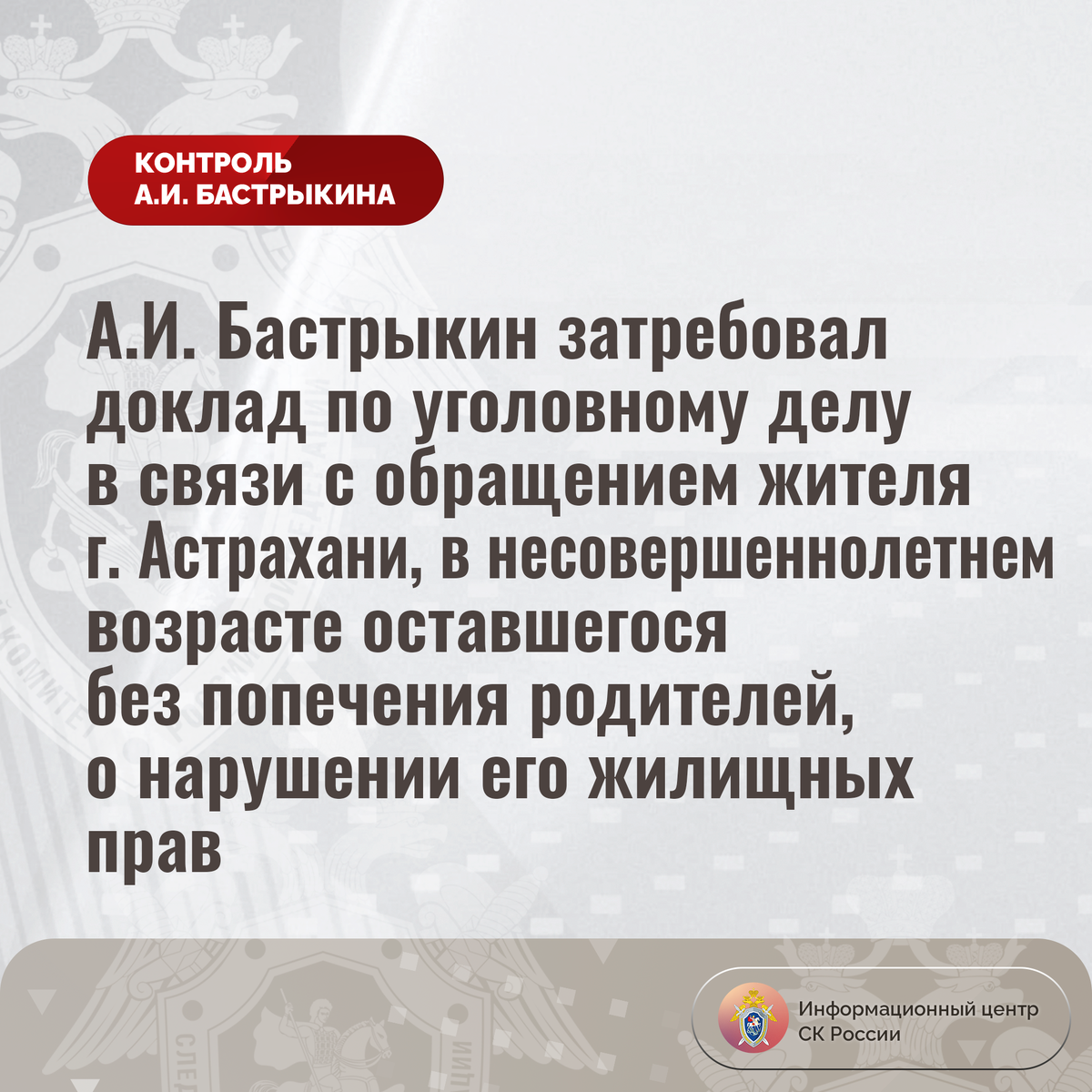 А.И. Бастрыкин затребовал доклад по уголовному делу в связи с обращением жителя г. Астрахани, в несовершеннолетнем возрасте оставшегося без попечения родителей, о нарушении его жилищных прав К Председателю СК России А.И. Бастрыкину через Информационный центр обратился житель города Астрахани, в несовершеннолетнем возрасте оставшийся без попечения родителей, по вопросу длительного непредоставления ему положенного по закону жилья. С 2012 года заявитель состоит на учете лиц, подлежащих обеспечению жилыми помещениями, однако до настоящего времени мер к реализации его прав не принято. Обращения в компетентные органы результатов не принесли. В СУ СК России по Астраханской области расследуется уголовное дело. Председатель Следственного комитета Российской Федерации Александр Иванович Бастрыкин затребовал у руководителя СУ СК России по Астраханской области Ибрагима Шамсудиновича Могушкова доклад о ходе и результатах расследования уголовного дела. Исполнение поручения поставлено на контроль в ц