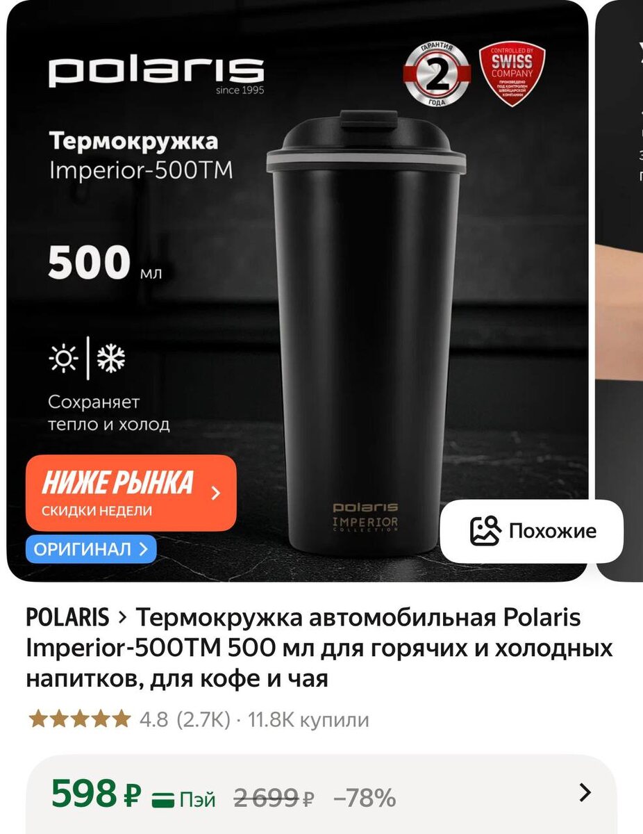 😲🤐😴Термокружка автомобильная Polaris Imperior-500TM 500 мл для горячих и холодных напитков, для кофе и чая
