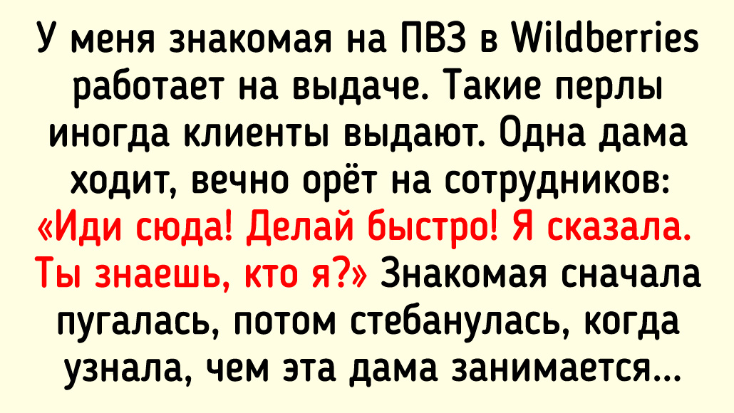 У меня знакомая на ПВЗ в Wildberries работает на выдаче. Такие перлы иногда клиенты выдают. Одна дама ходит, вечно орёт на сотрудников: «Иди сюда! Делай быстро! Я сказала. Ты знаешь, кто я?» Знакомая сначала пугалась, потом просто стебанулась, когда узнала, чем эта дама занимается.