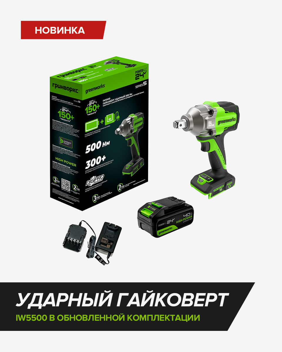 Когда важны мощность, компактность и удобство — выбирайте гайковерт Greenworks IW5500 (3805007CUB), 24V.