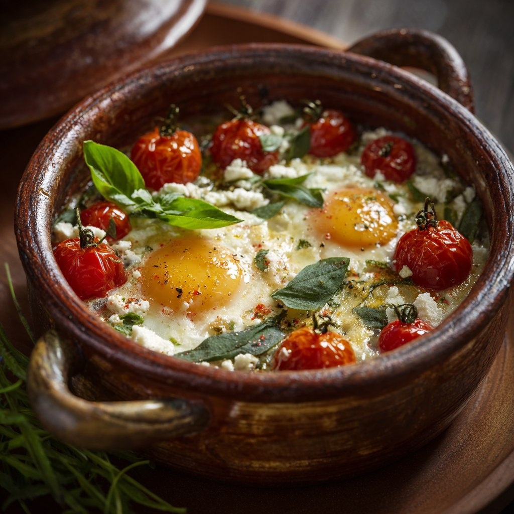 Ингридиенты - Яйца – 4 шт. - Помидоры черри – 150 г - Сыр фета – 100 г - Свежий базилик – несколько листьев - Оливковое масло – 1 ст. л. - Соль – по вкусу - Перец черный молотый – по вкусу Способ приготовления 1. Разогрейте духовку до 180°C. 2. Нарежьте помидоры черри на половинки и слегка сбрызните оливковым маслом. 3. Разложите помидоры в небольшой керамической или стеклянной форме для запекания. 4. Разломите яйца, аккуратно положите их поверх помидоров так, чтобы желток остался целым. 5. Посыпьте сверху раскрошенной фетой. 6. Добавьте соль и перец по вкусу. 7. Запекайте в духовке примерно 10-15 минут, пока белок не схватится, а желток останется слегка жидким (по желанию). 8. Выньте из духовки и украсьте свежими листьями базилика. 9. Подавайте сразу же, возможно с тостами или свежим хлебом.