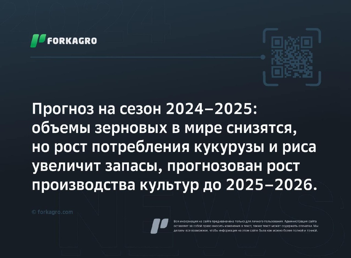 Прогноз на сезон 2024–2025: объемы зерновых в мире снизятся, но рост потребления кукурузы и риса увеличит запасы, прогнозован рост