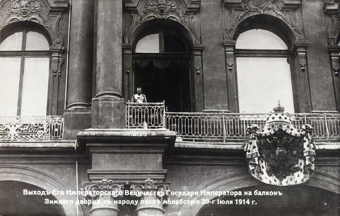 Николай 2 зачитывает манифест об объявлении войны Германии 2 августа 1914 года. Всё как всегда: малой кровью на чужой территории за 3 дня. Да ладно, не говорил он такого. Опыт русско-японской войны явно сказался.