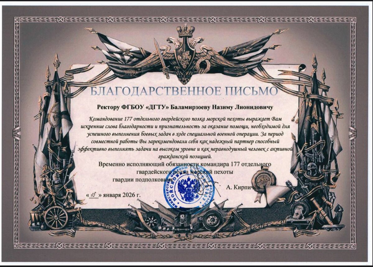 В адрес ректора Дагестанского государственного технического университета поступило благодарственное письмо от командования 177 отдельного гвардейского полка морской пехоты, в лице временно исполняющего обязанности командира полка, гвардии полковника А. Кирпичёва. В нём выражается искренняя признательность коллективу университета за оказанную помощь, которая стала важным вкладом в успешное выполнение боевых задач в ходе специальной военной операции. Кроме того, в письме подчёркнута активная гражданская позиция ректора вуза и его коллектива, их неравнодушие и готовность прийти на помощь в непростое для страны время. Назим Баламирзоев поблагодарил командование 177-го отдельного гвардейского полка за высказанное доверие и тёплые слова. Он подчеркнул, что сотрудничество с вооружёнными силами и поддержка военнослужащих, находящихся на передовой, важная составляющая миссии ДГТУ по патриотическому воспитанию молодёжи и применению потенциала университета на благо общества. Ректор также вырази