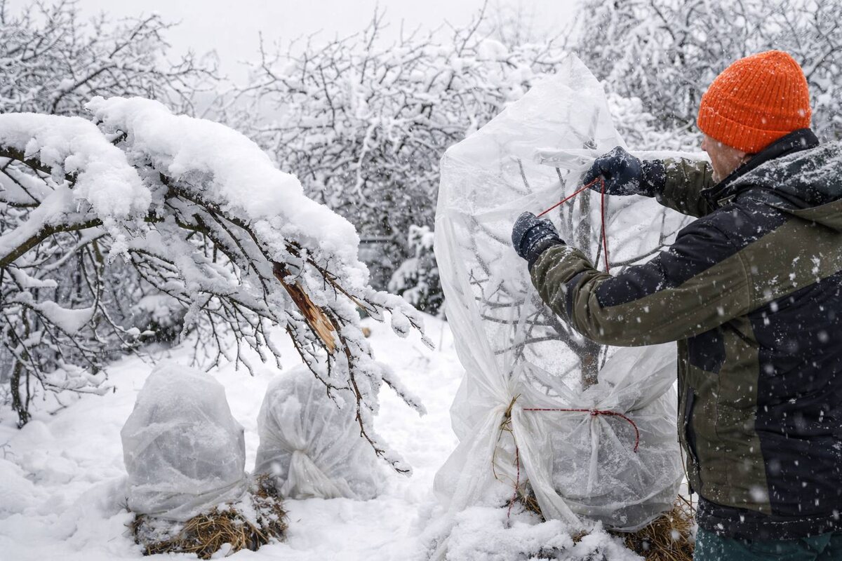 Зима 2025-2026 в Челябинской области обещает классическую уральскую суровость с устойчивым снежным покровом до 35-40 см, частыми снегопадами в декабре-январе и перепадами температур от -6 °C до -25 °C, что повышает риски обледенения крон и поломок ветвей под мокрым снегом. Январь станет самым холодным месяцем с ночными морозами до -21 °C, а февраль может удивить относительным потеплением, но с риском гололёда. Эти условия требуют усиленной подготовки садоводов для защиты растений. Мокрый снег и оттепели с последующими морозами спровоцируют ледяную корку на ветвях, особенно у хвойных и плодовых, нагружая их до критических пределов. В условиях прогноза на обильные осадки нагрузка на крону возрастёт, усугубляя деформации стволов. Несформированные кроны в уральском климате с перепадами температур пострадают сильнее. Очищайте снег осторожными круговыми движениями снизу вверх с помощью длинной штанги, обёрнутой мягким материалом, чтобы не повредить кору. При наледи фиксируйте ветви подпоркам