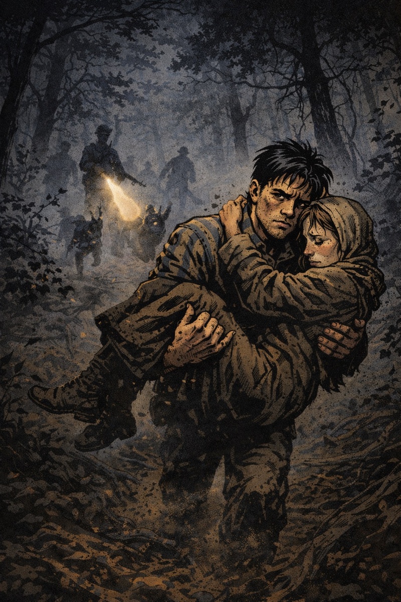 Все главы Ночь не наступила — она обрушилась. Туман сгустился так плотно, что свет прожекторов казался мутным пятном, размазанным по воздуху. Лагерь исчезал, растворяясь в серой массе, и в этом было что-то пугающе обнадеживающее. Антошка вывалился из трубы первым. Он упал в мокрую траву, не чувствуя ни холода, ни боли. Сердце колотилось так, будто хотело вырваться наружу. Он оглянулся — Ольга показалась следом, тяжело, неловко, но самостоятельно. — Тише, — прошептал он, помогая ей подняться. Где-то за спиной хлопнула дверь. Голоса. Немецкая речь резала слух. Николай кричал — нарочно громко, грубо, будто пьяный. Антошка понял: он делает своё дело. Они пошли, пригибаясь, почти на ощупь. Земля под ногами была мягкой, размокшей, каждый шаг грозил выдать их хлюпаньем. Антошка вёл вправо, туда, где по словам Семёна начинался лес. Луч прожектора прошёлся по туману совсем рядом. Антошка замер, прижав Ольгу к себе. Она дрожала — не от холода, от напряжения. Он чувствовал это каждой клеткой. — Д