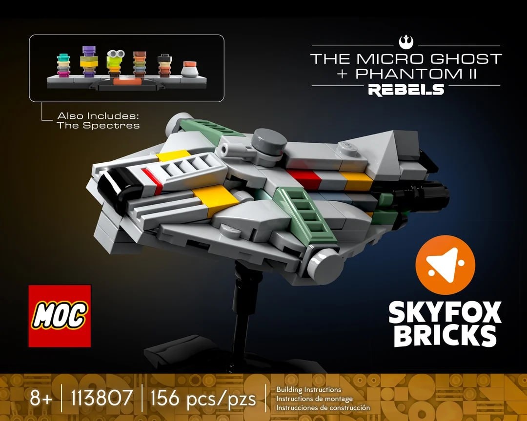 🚀 Skyfox2k продолжает серию микро-Star Wars: собрал Ghost с отстыковывающимся Phantom II и добавил всю команду Spectres на аккуратной подставке.
