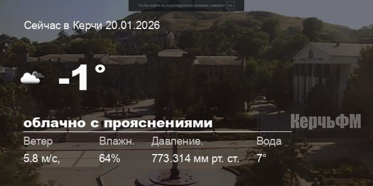 Сегодня днем в Керчи, 20 января, ожидается небольшая облачность, температура воздуха от -1.5° до -0.8°С, ветер северный 6.4 м/с, порывы до 9.71 м/с, давление 773.3 мм рт. ст., влажность 63%. Ближайшей ночью ожидается пасмурная погода, температура -1.6°С. Завтра, 21 января, в течение суток ожидается ясная погода; ночью -1.6°С, днем -1.2°С, ветер северный 2.96 м/с. - Феодосия от -4.5° до -2.1°С, ⛅ облачно с прояснениями, море: 4°C - Судак от -6.2° до -1... подробнее Подписывайся на КерчьФМ.РФ @kerchfm