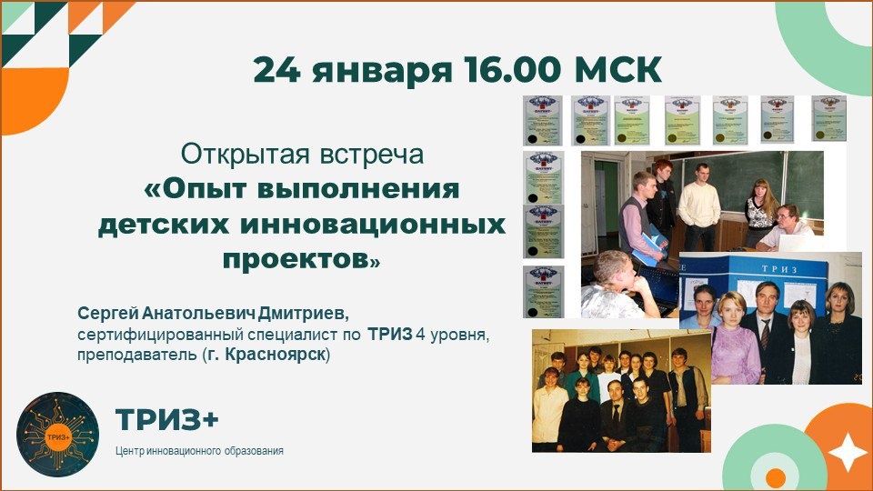 ! 📆 Уже в эту субботу, 24 января в 16.00 по МСК состоится открытая встреча с Сергеем Анатольевичем Дмитриевым, сертифицированным специалистом по ТРИЗ 4 уровня. 📚Сергей Анатольевич поделится опытом выполнения инновационных проектов со школьниками. 🚒"Устройство тушения пожара", ❄️"Способ защиты крыши от образования сосулек", 🔐"Охранная сигнализация", 🧊"Способ разрушения льда" 📃и многие другие изобретательские проекты, реализуемость которых подтверждена патентами. До встречи!