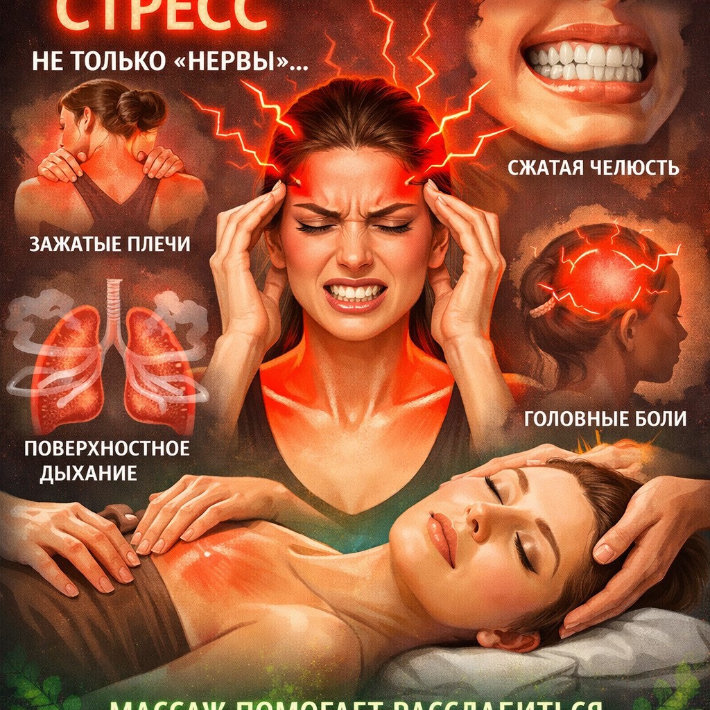 Стресс – это не только “нервы”, это вполне физические штуки: зажатые плечи, сжатая челюсть, поверхностное дыхание, головные боли