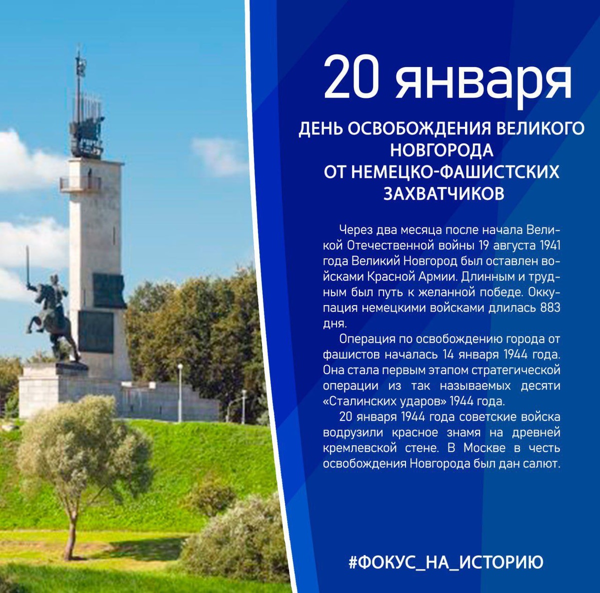 👋 Сегодня мы вспомним важные события прошлого и узнаем, почему именно этот день оставил яркий след в истории. 📆 20 января – День освобождения Великого Новгорода от немецко-фашистских захватчиков