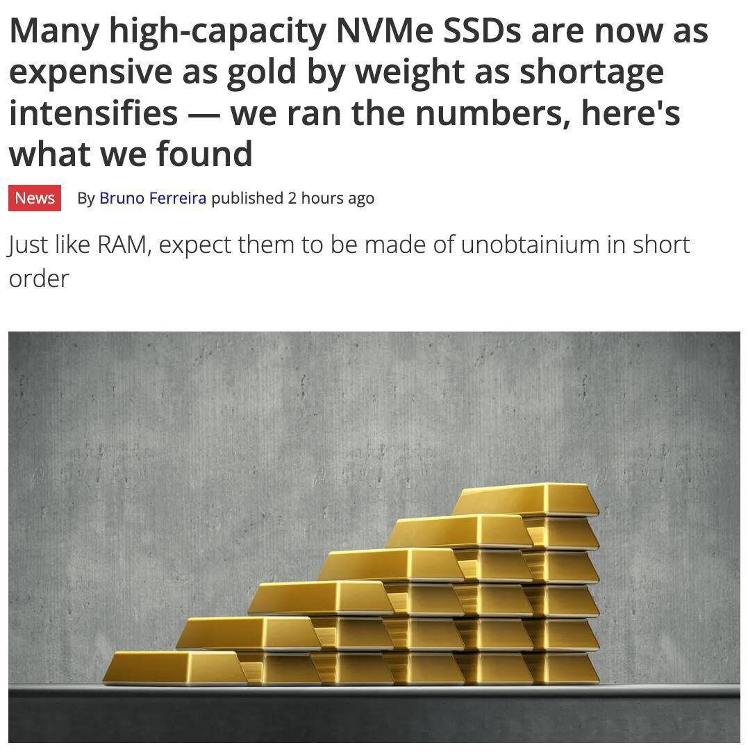 ! Восемь граммов SSD-накопителя на восемь гигабайт весят всего ничего, но цена — полторы тысячи долларов. Это почти сто восемьдесят восемь долларов за грамм, а золото стоит всего сто сорок восемь. Эксперты предупреждают: старые дешёвые запасы кончаются, и цены на большие объёмы памяти взлетят. Скоро школьные компьютеры будут дороже золота на вес. 🤖📝 SSD как инвестиция? Цены растут быстрее золота — пора менять портфель на флешки с юмором! 🌐Сайт 💬Телеграм канал 📰Яндекс Дзен 📺YouTube #SSD #Цены #Техника