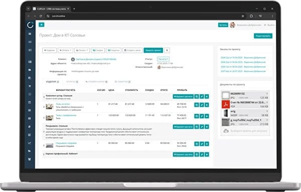 CURS24 — это специализированная CRM‑система и платформа управленческого учёта для шторного и проектного бизнеса: единое место, где управляется всё — от первой заявки до прибыли по каждому заказу. 💡 Чем CURS24 отличается от других систем учёта: ✅ Всё в одной системе — от заявки до зарплаты Не нужно «склеивать» CRM, Excel и учёт: лиды, заказы, производство, финансы, склад и зарплаты сотрудников работают в одном контуре. ✅ «Живое коммерческое предложение» Интерактивное КП по ссылке, которое обновляется автоматически, позволяет продавать дороже и снижает процент отказов до единичных. ✅ В 10 раз быстрее расчёт заказов Автоматизированные формулы под ваши изделия, ткани и услуги убирают ручные вычисления и ошибки в Excel. ✅ Единые стандарты компании Шаблоны расчётов и процессов зашиты в систему: новые дизайнеры и менеджеры начинают считать проекты по корпоративным стандартам уже через несколько дней. ✅ Управленческий учёт, а не только CRM Видно маржу по заказам, товарам, услугам и сотр