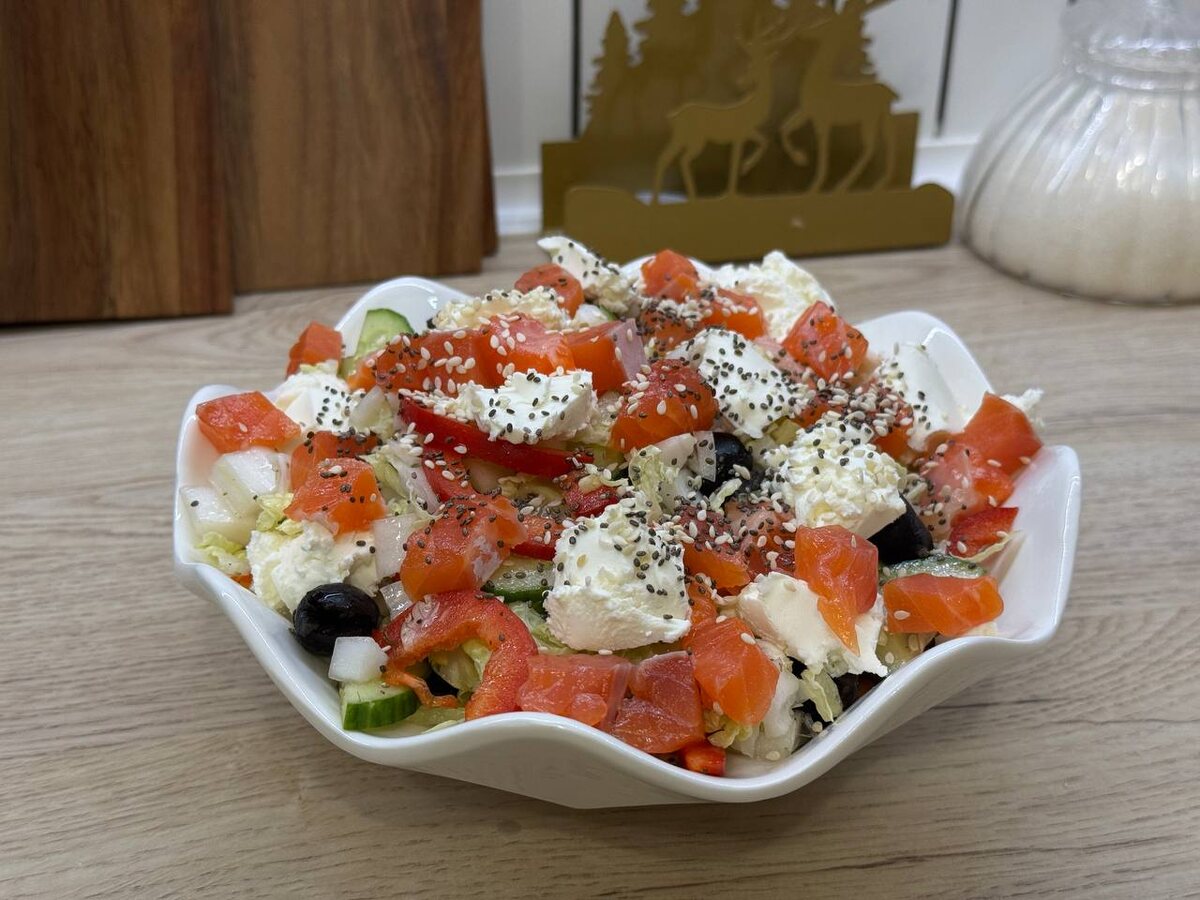 Слабосолёную рыбу нарежьте аккуратными кубиками. Болгарский перец нарежьте на четвертинки, а затем тонкими полукольцами. Огурец нарежьте полукольцами средней толщины. Пекинскую капусту или листовой салат измельчите руками или ножом. В салатник отправьте зелень, маслины, перец и огурец. Полейте оливковым маслом, добавьте прованские травы и чайную ложку лимонного сока. Всё аккуратно перемешайте. Сверху выложите творожный сыр или фету (можно покрошить или выложить кусочками) и слабосолёную рыбу. Посыпьте салат семенами чиа и кунжутом. Салат готов - сочный, яркий и невероятно вкусный! Приятного аппетита! #греческийсалат #салат #рецепты #рецепт #рецептыKateVi11