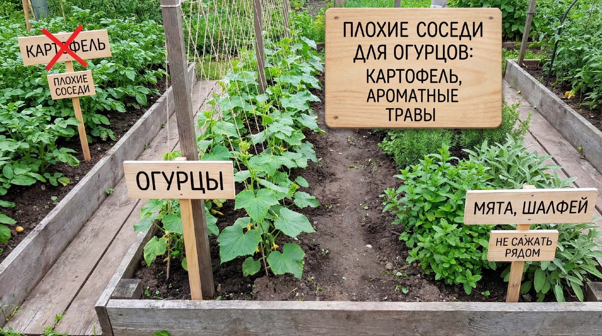 Огурцы — капризные растения. Даже при хорошем уходе они могут плохо расти, горчить или болеть из-за неправильных соседей. Ниже — полный и понятный разбор, что нельзя сажать рядом с огурцами, почему это вредно и какие ошибки совершают дачники чаще всего. Огурцы: Если рядом растёт «плохой сосед», он: Результат — слабые плети, пустоцвет и низкий урожай. 👉 Огурцы рядом с картофелем часто болеют и горчат. 👉 Вместе страдают оба растения. 👉 Огурцы растут медленно и дают меньше плодов. 👉 С огурцами это не работает. Для баланса — правильные соседи: Они: Можно ли сажать огурцы рядом с помидорами?