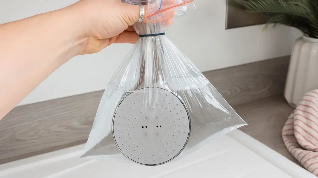 Хорошая новость — чаще всего дело не в сантехнике и не в трубах. Виноват обычный известковый налёт, и убрать его можно без разборки, инструментов и лишних затрат. Понадобится всего три вещи:уксус, пакет и резинка. В водопроводной воде содержатся кальций и магний. Каждый раз, когда вода высыхает, микроскопические частицы остаются на поверхности.