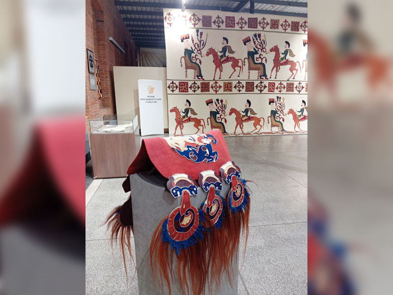 Помимо большого войлочного «пазырыкского» ковра на выставке представлены уникальные предметы: седельная покрышка, капор (головной убор), ритуальный ковер скифо-сарматского периода, ковер со львами и т.д.