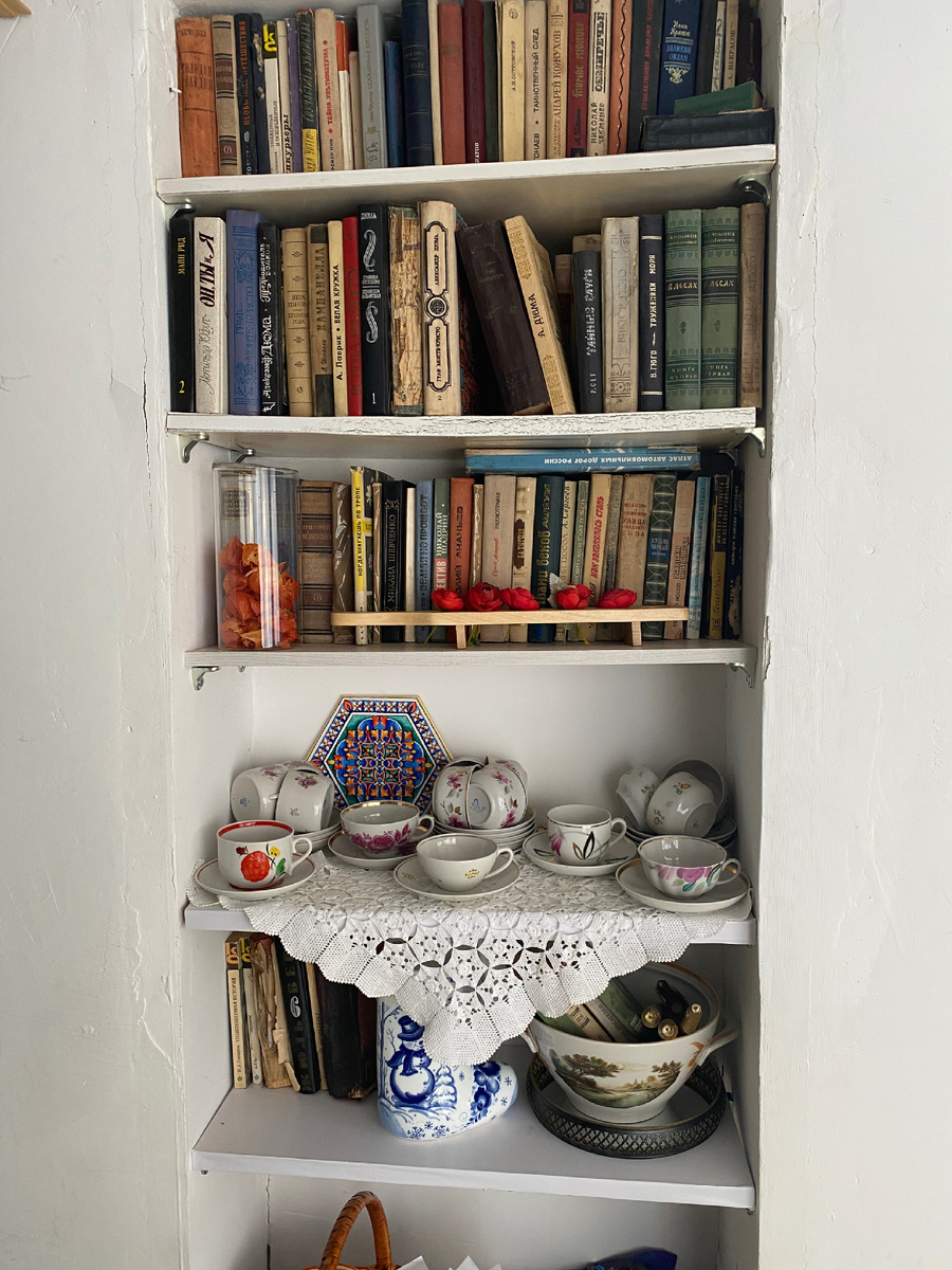 Когда-то давно в ремонтном порыве и за отсутствием необходимости дверной проем заложили. Затем, уже во времена Лисьей норы, веранду переделали в жилую комнату. А в получившейся нише установили полки для книг и фарфора.