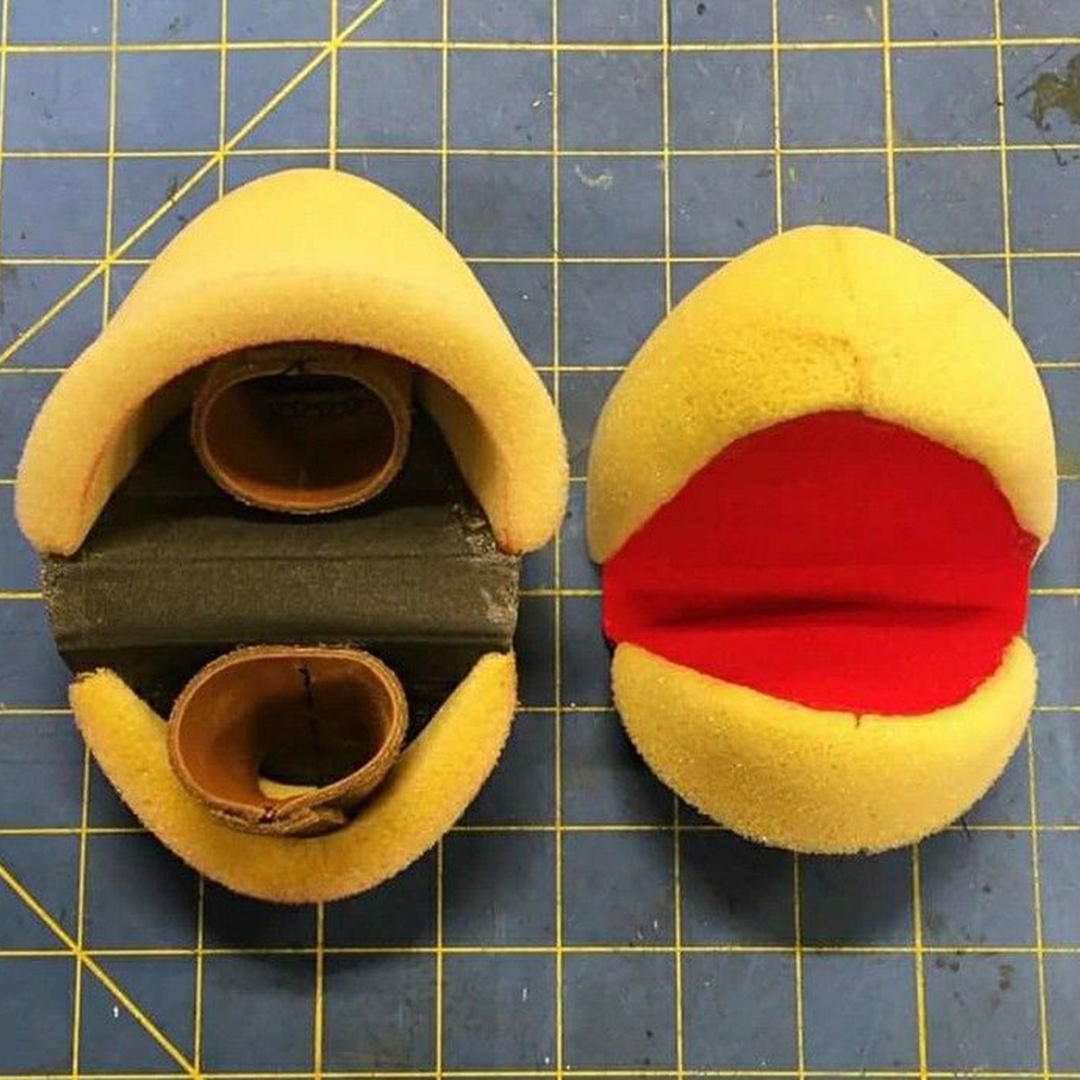 Одним из основных параметров определяющих размер будущей куклы является способ управления куклой. Если планируется, что рот будет открываться, а у маппетов он огромный – буквально от уха до уха, то вся кисть кукловода полностью располагается в голове – большой палец в нижней челюсти, остальные в верхней, где под них готовят специальные петли. Руки таких кукол, как правило, фиксируются на тростях, с помощью которых они и приводятся в движение. Для более сложных кукол, которыми управляют два человека устройство куклы может быть таким как показано на рисунке ниже. Со стороны это выглядит очень круто, подобные куклы были и в «Маппет-шоу», но тут уже требуется слаженная работа сразу двух кукловодов. В том случае, когда рот может быть закрыт в силу каких-то причин. Игрушка напоминает Петрушку у которого мизинец и большой палец управляют руками, а указательный - головой. Именно на этом варианте мы остановились для нашего маппета. Тем не менее при всей кажущейся простоте, подводных камней хват