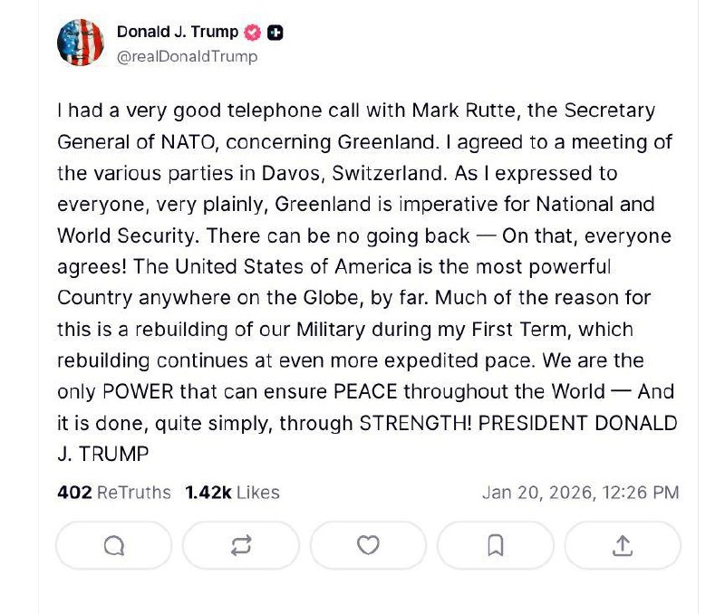 !» Трамп сообщил, что провел «очень хороший разговор» с генсеком НАТО о судьбе Гренландии и дал ясно понять «всем», что остров имеет «первостепенное значение для национальной и глобальной безопасности». «Я согласился на встречу различных сторон в Давосе, чтобы обсудить это», — написал он после разговора с Рютте. По словам Трампа, США — единственная «держава», которая может обеспечить «мир во всем мире». Убедительно? 👍«БайБайден» в МАХ