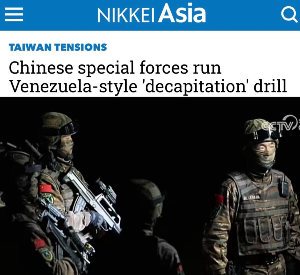 ». «Новые учения Китая направлены на демонстрацию аналогичных возможностей, которые показала операция США по захвату венесуэльского президента Николаса Мадуро. Согласно видеозаписи центрального телевидения Китая, учения включали определение здания с целями с помощью военного дрона, последующую ночную вылазку группы специального назначения. Группа использовала арбалеты военного образца, чтобы пройти мимо вражеских постов охраны и ликвидировать четырех «террористов». Учебный рейд был завершен менее чем за две минуты». 🤗 НАСОНОВ 🔴