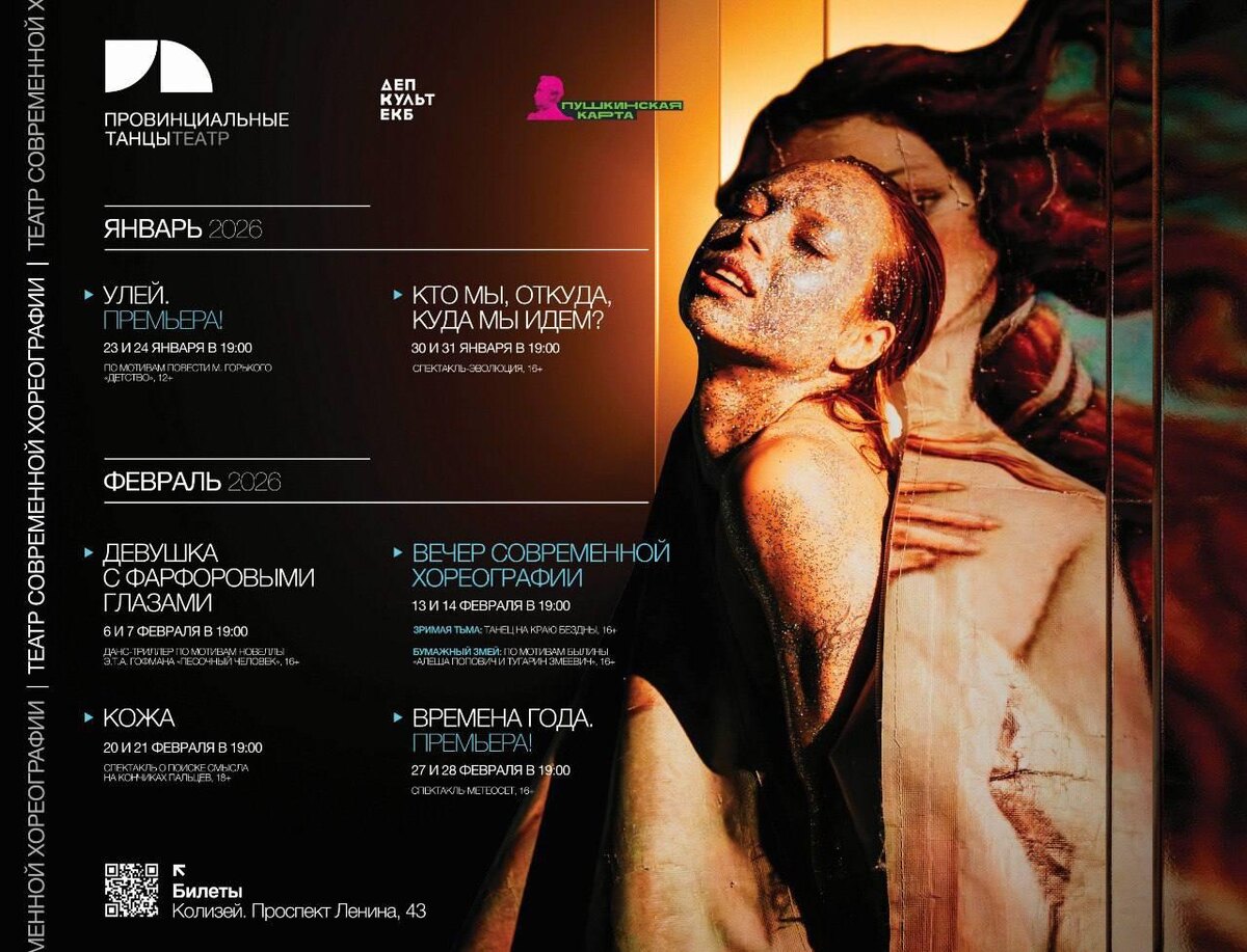 Екатеринбург Зимний репертуар театра "Провинциальные танцы" ГДЕ: Колизей, проспект Ленина, 43, г. Екатеринбург ▶ Билеты на сайте театра Действует Пушкинская карта Начало всех показов в 19:00 💡Будьте внимательны: двери театра открываются за 40 минут до начала показа, а закрываются через 10 минут после начала спектакля! ▫30, 31 января КТО МЫ, ОТКУДА, КУДА МЫ ИДЕМ? | 16+ | 80 мин Хореограф: Павел Глухов ▫6, 7 февраля ДЕВУШКА С ФАРФОРОВЫМИ ГЛАЗАМИ | 16+ | 60 мин Хореограф-постановщик: Татьяна Баганова ▫13, 14 февраля [вечер современной хореографии] | 16+ | 80 минут | с антрактом 🔹ЗРИМАЯ ТЬМА | ПРЕМЬЕРА📌 Хореограф-постановщик: Владислав Мирошниченко 🔸БУМАЖНЫЙ ЗМЕЙ Хореографы-постановщики: Владислав Мирошниченко, Руслан Трушкин ▫20, 21 февраля КОЖА | 18+ | 60 минут Хореограф: Маура Моралес ▫27, 28 февраля ВРЕМЕНА ГОДА | 16+ | 60 мин | ПРЕМЬЕРА📌 Хореографы-постановщики: Екатерина Занина, Кирилл Зайцев фото: Дарья Сергачева --------------- Опубликовать своё объявление в канале "
