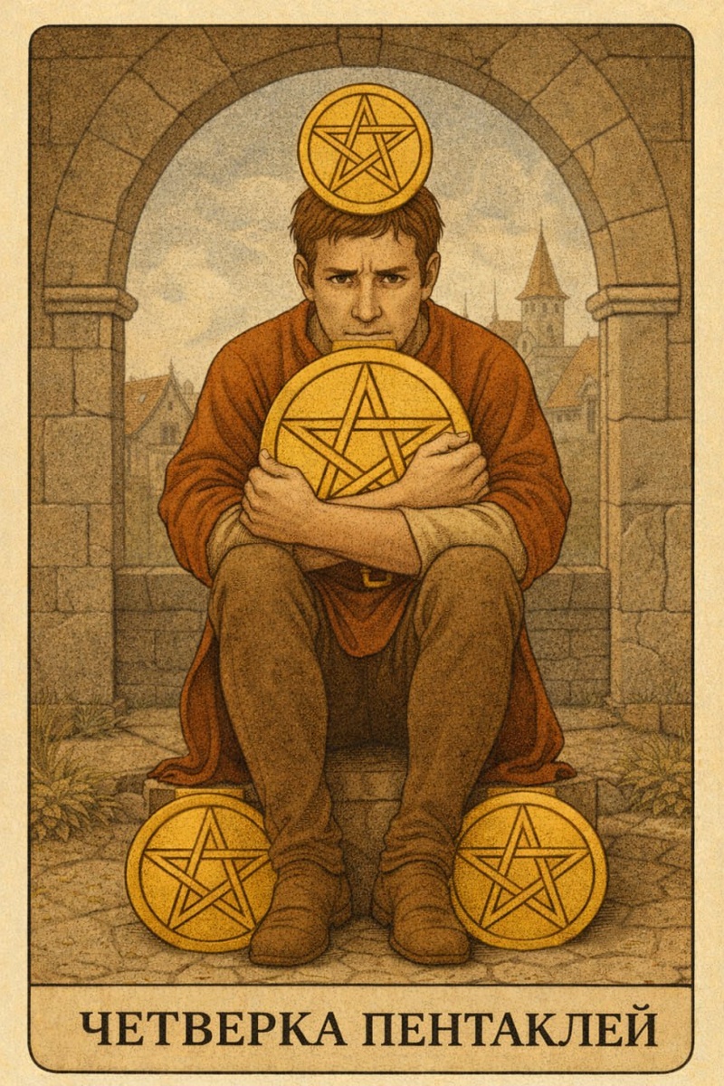 Я сижу крепко, будто врос в землю. Один пентакль я держу у груди, как обещание безопасности. Два под ногами, они не дают мне сдвинуться с места. Четвертый венчает голову, и в нем моя мысль о контроле. Я собрал всё, что смог, и теперь держу. Держу так, будто мир вот-вот попытается отнять. Вы часто думаете, что я про жадность. Про страх потерять. Но это лишь верхний слой. Четверка Пентаклей говорит о моменте, когда человек впервые осознает ценность того, что имеет. И вместе с этим приходит тревога, что все нажитое непосильным трудом ценное можно утратить. Я не отказываюсь делиться из злобы. Я просто ещё не уверен, что почва подо мной устойчива. Я помню, как было пусто, помню, как не хватало. И теперь мой инстинкт шепчет: удержи, это твое, закрой, защити. Но удержание тоже имеет цену. Чем сильнее я сжимаю, тем меньше чувствую движение жизни. Деньги, ресурсы, чувства, власть, статус - всё это требует циркуляции. Когда поток останавливается, энергия начинает тяжёлеть, вязнуть, зависать.