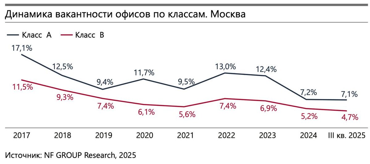 По данным консалтинговой компании NF Group, интерес к покупке/аренде офисных площадей в Москве сохраняется на высоком уровне. По итогам первых трех кварталов 2025 года, показатель доли вакантных помещений снизился в классах А и В на 0,1 и 0,5 пункта соответственно. При этом в III квартале зафиксирован рекордно высокий ввод новых офисов, практически на уровне отдельных годовых показателей — 473 тыс. м². По прогнозам, доля вакантных помещений будет оставаться на низком уровне, близком к историческому минимуму. Офисная недвижимость представлена в фонде «Активо шестнадцать» (БЦ «Протопоповский», Москва).