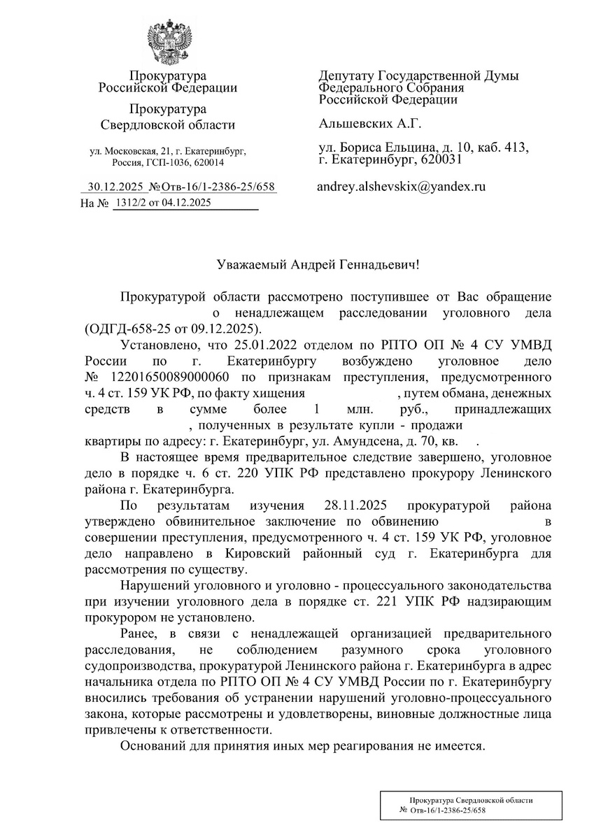 Несколько лет назад на прием пришел мужчина, чья жизнь рухнула в один момент. Из-за мошенника он лишился денег от продажи единственного жилья – квартиры на Амундсена, 70. Наплевательское отношение полиции к его беде стало вторым ударом. Правоохранители, которые должны защищать, просто отвернулись. Каждый визит в райотдел становился испытанием: надежда таяла, а силы иссякали. Депутатские запросы в областную прокуратуру разрушили стену безразличия. Она заставила следствие работать. И вот под конец прошлого года уголовное дело передали в суд. Подсудимому грозит до 10 лет лишения свободы. Хочется повторить прописную истину: не сдавайтесь. Если вы оказались перед лицом беззакония, помните, что я рядом и готов помогать. Обращайтесь за поддержкой, отстаивайте свои права. Решимость обязательно приведет к результату.