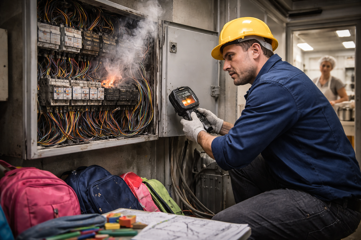 После каникул нагрузка возвращается скачком: одновременно включаются пищеблоки, вентиляция, бойлеры, мастерские, освещение. Сеть, которая несколько недель работала в мягком режиме, получает пиковый старт в первый же день. Именно в эти часы проявляются слабые контакты, усталость автоматов и скрытые перекосы фаз. За период без нагрузки соединения остывают и «отпускаются», в щитах накапливается влага, изоляция стареет быстрее из-за перепадов температуры. При резком включении растёт переходное сопротивление, появляются локальные перегревы, автоматы реагируют несимметрично. То, что держалось в мае, может не выдержать в сентябре. Здесь совмещаются высокая мощность и изношенная инфраструктура. До каникул объект мог функционировать без нареканий, поэтому проблемы сентября кажутся внезапными. На самом деле простой создаёт эффект нового пуска, который сеть проходит тяжелее, чем обычные ежедневные режимы. Дефекты, копившиеся годами, проявляются одномоментно. События выглядят разрозненными, но име