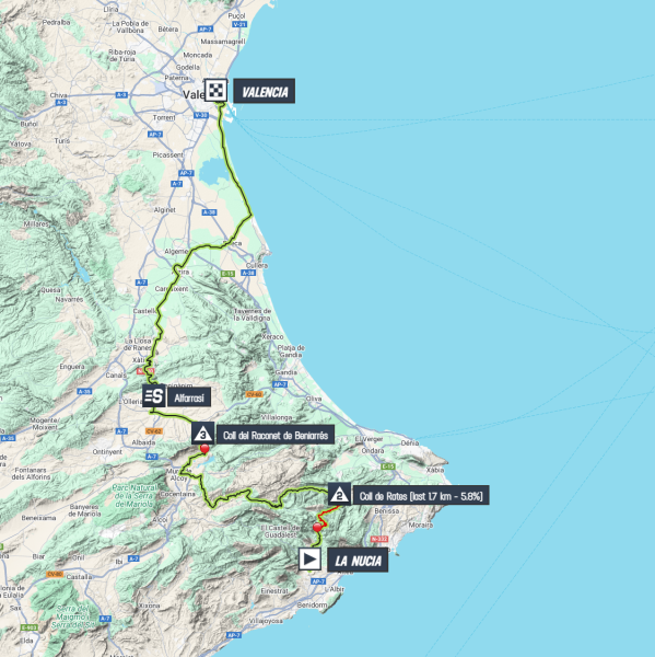 В воскресенье, 25 января, на востоке Испании пройдет очередная шоссейная велогонка — 42-й выпуск классики Гран-при Валенсии (Clàssica Comunitat Valenciana 1969). Это стандартный пункт в календаре между Гран-при Кастельона и Трофеем Кальвии. Старт будет в городке Ла-Нусия. Финиш — в Валенсии на Авениде Франсии, известной по финишам прошлых лет. Длина маршрута — 196,9 км. Первая половина дня будет тяжелой. Почти сразу — подъем на Колль-де-Ратес (14 км, 4.6%). Потом — изматывающий рельеф «ромпепьернас» («ломающий ноги») без равнин, ведущий к главной сложности дня: Альто-де-Бениаррес. Этот подъем протяженностью почти 5 км содержит участки с градиентом до 11%. После вершины начнется длинный спуск, а затем — равнинная часть. Здесь главным фактором может стать ветер, особенно на подходе к Валенсии. Финиш на широкой авендии должен завершиться массовым спринтом, если, конечно, отрыв не сумеет продержаться. На старт выйдут 7 команд Мирового тура и 10 проконтинентальных коллективов. Среди фавори