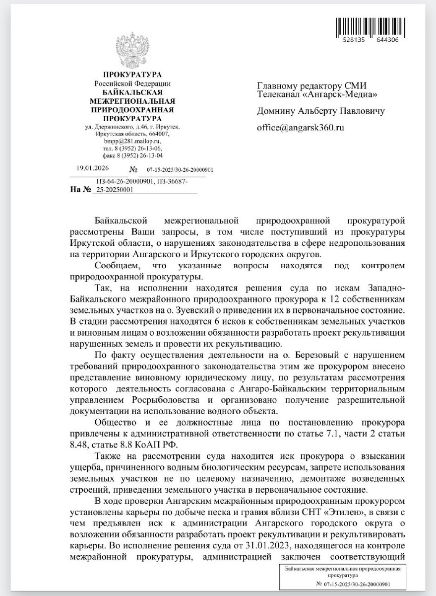 », муниципальная собственность), расположенном в границах Ангарского городского округа. Там на протяжении длительного времени осуществляется складирование огромных объемов песчано-гравийной смеси (ПГС). Кучи размером с трехэтажный дом и видно их даже на снимках из космоса. Данная деятельность наносит ущерб городским лесам и окружающей среде. Легальность происхождения хранящейся там ПГС тоже вызывает вопросы, ведь именно туда ездили самосвалы с нелегальной добычи возле СИЗО-6. Телеканал «360 Ангарск» получил ответ на запрос СМИ от Байкальской межрегиональной природоохранной прокуратуры. В частности сказано, что в отношении складирования ПГС Ангарским межрайонным природоохранным прокурором с привлечением специалистов контролирующих органов организована проверка по размещению площадки для хранения ПГС в городских лесах. Результаты данной проверки находятся под контролем межрегиональной прокуратуры. Будем держать эту историю на контроле. 📱 Мой канал в MAX