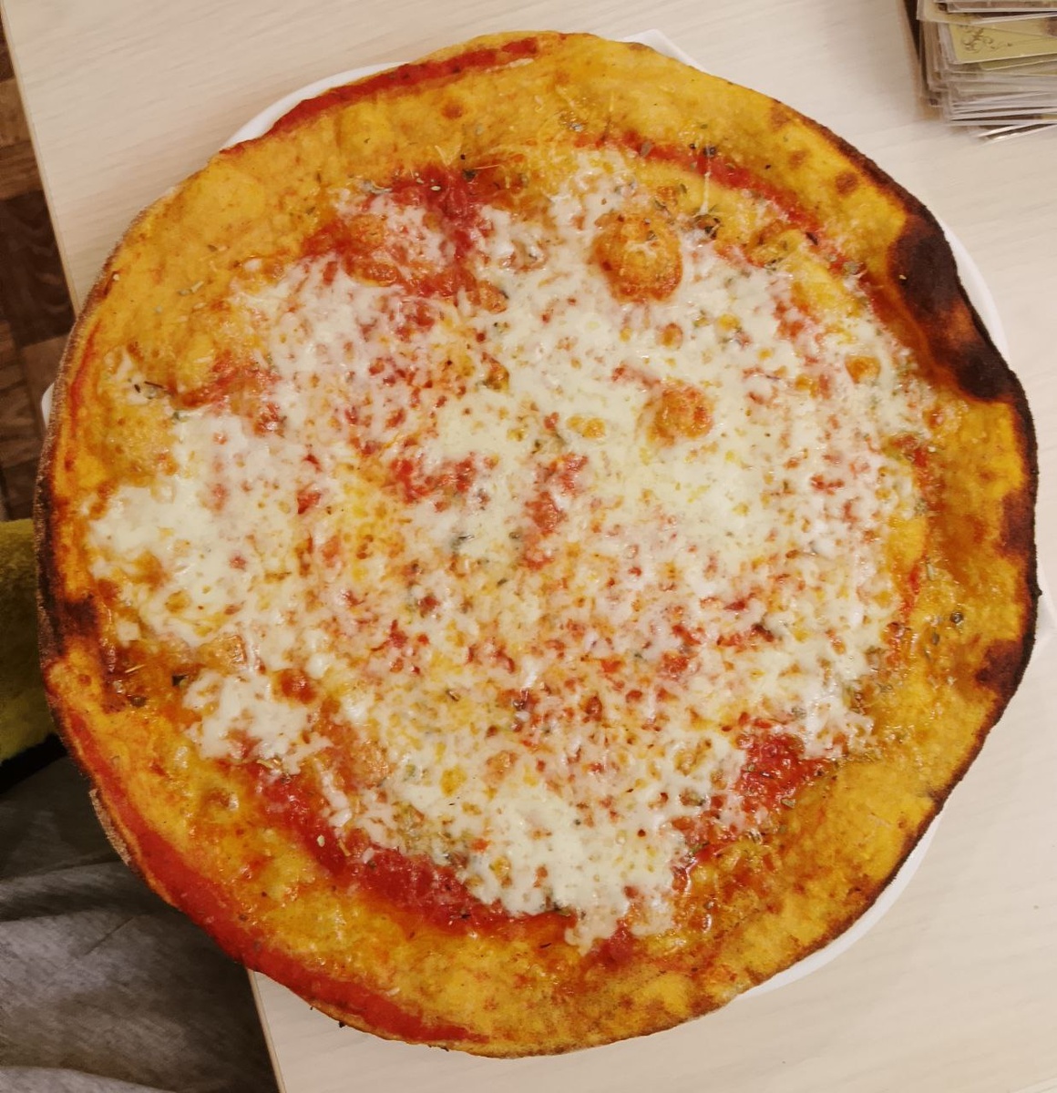 Рецепт рассчитан на 2 тонкие пиццы по 30 см (2 основы по 180 г). __________________________________________________________________________________________ Пекарский процент: мука 100, вода 56, соль 2.2, дрожжи сухие 0.1, солод диастатический 2, масло оливковое 1.1. Итого: 161.4. __________________________________________________________________________________________ Для теста: Мука пшеничная 223.1 г, вода комнатной температуры 125.9 г, соль 4.9 г, дрожжи сухие 0.22 г, солод 4.5 г, масло 2.5 г. Для начинки: Моцарелла с пониженным содержанием жидкости 2 по 90 г, соус простой томатный, пармезан 2 по 8 г (по вкусу), орегано сушеное, масло оливковое "Экстра Верджин" для сбрызгивания. Приготовление. Источники: