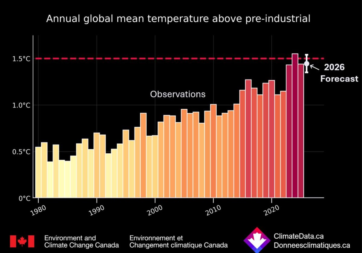 Не успела Всемирная метеорологическая организация подтвердить, что 2025 год был одним из трех самых теплых лет, как канадские метеорологи заявили: 2026 год войдет в четверку самых жарких за всю историю наблюдений. Согласно прогнозу Министерства окружающей среды и изменения климата Канады (ECCC) по глобальной температуре, беспрецедентное потепление последних трех лет продолжится и в 2026 году. Предполагается, что , температура в 2026 году будет находиться в том же диапазоне, что и 2023 и 2025 годы, которые, по данным Всемирной метеорологической организации, являются вторым и третьим самыми жаркими за всю историю.