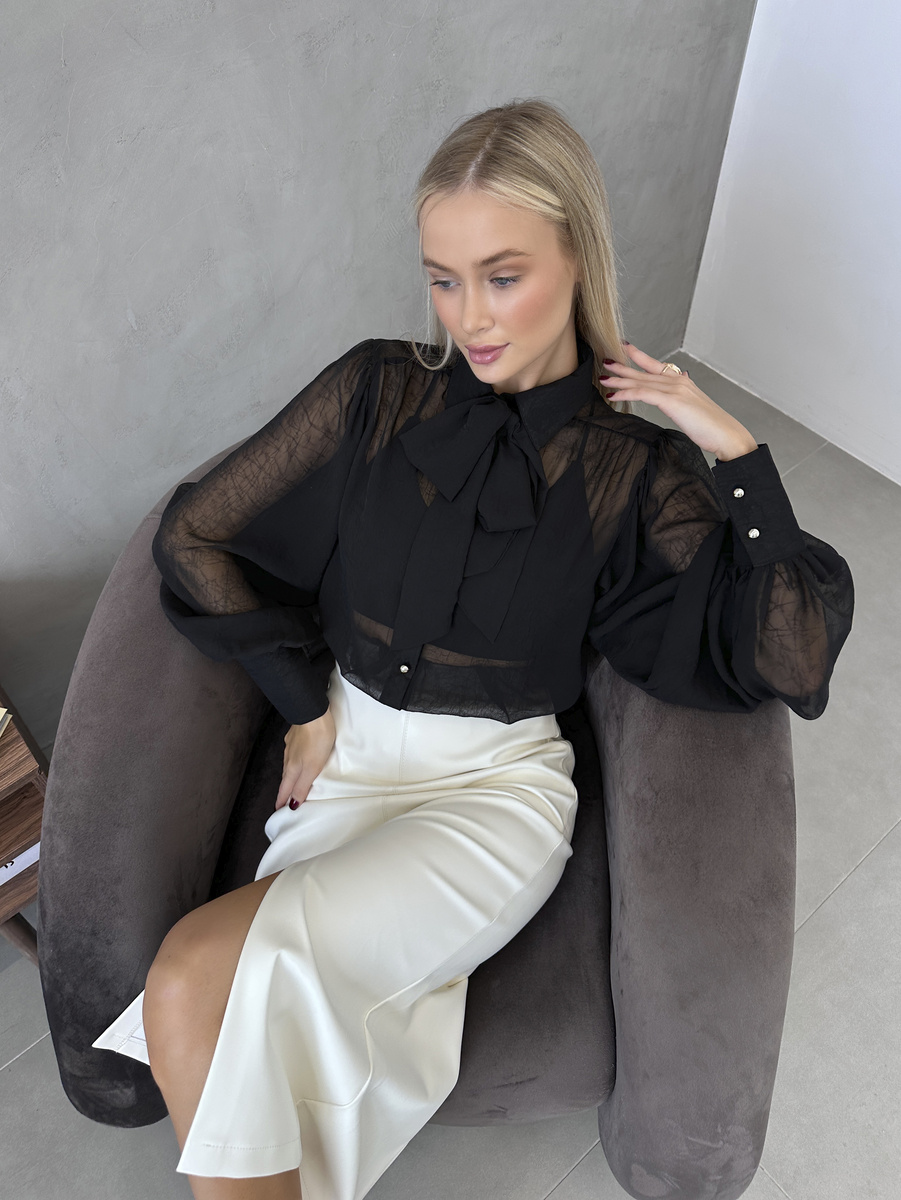 Заказать блузку Vashbrend на Wildberries - здесь. Полупрозрачные блузки с бантом — вещь с характером. С одной стороны, это тренд на новую женственность. С другой — высокий риск скатиться в образ первоклассницы. Многие обходят такие вещи стороной, боясь выглядеть несерьезно или наивно. Но секрет не в самой блузке, а в том, что ее окружает. Чтобы бант выглядел статусно, а не инфантильно, нужно соблюдать несколько правил стиля. Главная ошибка — пытаться поддержать романтику блузки другими романтичными вещами. Оборки на юбке, цветочный принт или мягкий трикотаж превратят вас в куклу. Чтобы образ выглядел современно, нужно работать на контрасте. Мягкая, летящая ткань блузки требует жесткой, грубой оправы. Бант на шее — это уже очень активный аксессуар. Он занимает много визуального места в портретной зоне. Любые украшения на шее будут лишними и создадут визуальный шум. Так как блузка не имеет жесткой формы, форму должны держать аксессуары. Полупрозрачная блузка с бантом не требует от вас бы