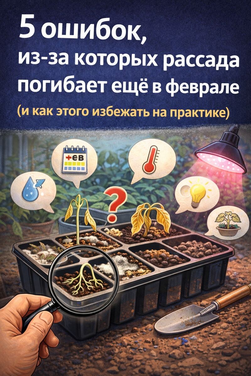 Как их избежать на практике Февраль — самый коварный месяц для рассады. Света ещё мало, батареи жарят, воздух сухой, а желание «помочь» растениям слишком велико. В результате даже у опытных дачников: - стебли вытягиваются, - листья бледнеют, - ростки падают, - почва зацветает плесенью. Ниже — пять ошибок, которые убивают рассаду ещё до весны, и конкретные способы их избежать. В феврале естественный свет длится в среднем 7–8 часов. Для нормального роста большинству культур нужно 12–14 часов освещения. Что происходит при раннем посеве без идеальных условий: - томаты вытягиваются до 10–15 см уже через 2 недели, - стебель тонкий, как нитка, - растение тратит силы не на корни, а на «побег к свету». Как правильно: - томаты — сеять не раньше конца февраля – начала марта - перцы и баклажаны — середина февраля - капуста — конец февраля - цветы — индивидуально по культуре Если нет фитолампы — лучше отложить посев на 1–2 недели. Рассада погибает не от жажды, а от избытка воды. Опасные признаки: -