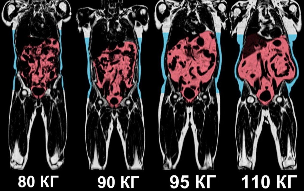 Вот так выглядит МРТ мужчин весом 80, 90, 95 и 110 кг. На последнем снимке висцеральное ожирение особенно красноречиво: видно, как жир обволакивает и cдавливает внутренние органы.