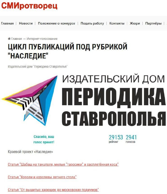 ♥️ Издательский дом "Периодика Ставрополья", частью которого является и наша газета, вышел в финал всероссийского голосования. Сейчас проходит народное голосование, которое определит всего одного победителя среди СМИ всей страны. Мы просим пройти по ссылке и отдать свой голос за нас, ваших журналистов🤗 Всё очень просто и займёт меньше минуты. Никакой регистрации. Нажать "Проголосовать", выбрать 10 баллов и нажать "ок". Голосовать можно с нескольких устройств один раз в сутки (например, через Wi-Fi, после чего отключить его, и, обновив страницу, проголосовать ещё раз через мобильный интернет). До завершения голосования осталось всего несколько дней и без вашей поддержки не обойтись🤗 Ссылка для голосования👇👇 https://concours.nazaccent.ru/internet-voting/tsikl-publikatsij-pod-rubrikoj-nasledie/ Спасибо всем, кто нас поддержал♥️