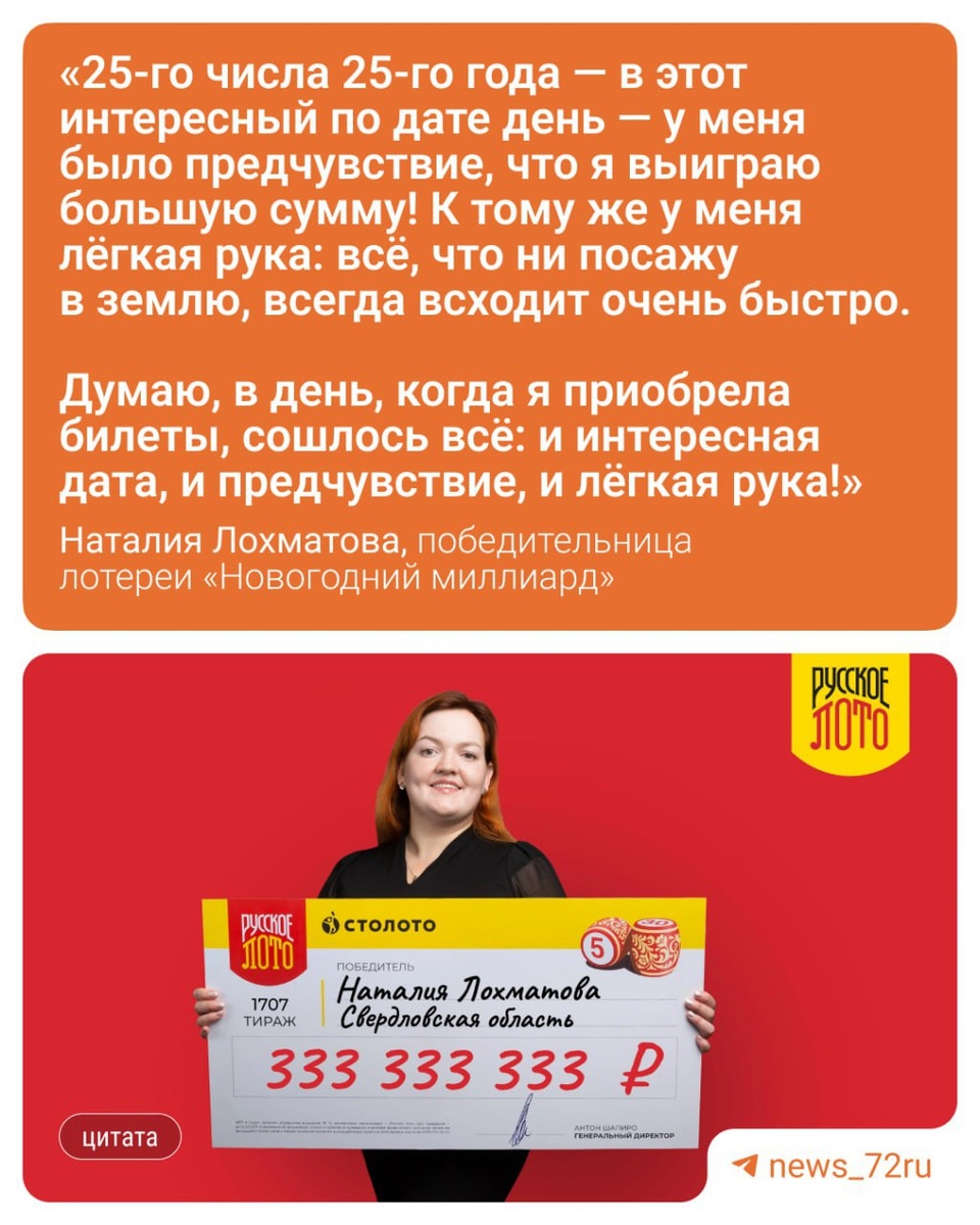 ». 333 млн рублей выиграла жительница Свердловской области Наталия Лохматова. Она — педагог-психолог, живёт в небольшом посёлке. Сейчас Наталия находится в отпуске по уходу за двухлетним сыном. В её семье участие в лотереях — это традиция, которой всегда следуют в Новый год. Поэтому 25 ноября она купила несколько билетов, где были восьмерки — счастливое число Наталии. В январе женщина пропустила новогодний эфир, поэтому о победе узнала позже, зайдя в личный кабинет «Столото». Увидев сумму, она даже не поверила собственным глазам. 💳 После удержания налога она получит 261,6 млн рублей. Часть денег она планирует потратить на благотворительность, а также хочет помочь маме. Остальное потратит на семью. Помимо жительницы Свердловской области, в лотерее треть миллиона выиграл и житель Тюмени. Но он всё еще не пришел за своим выигрышем.